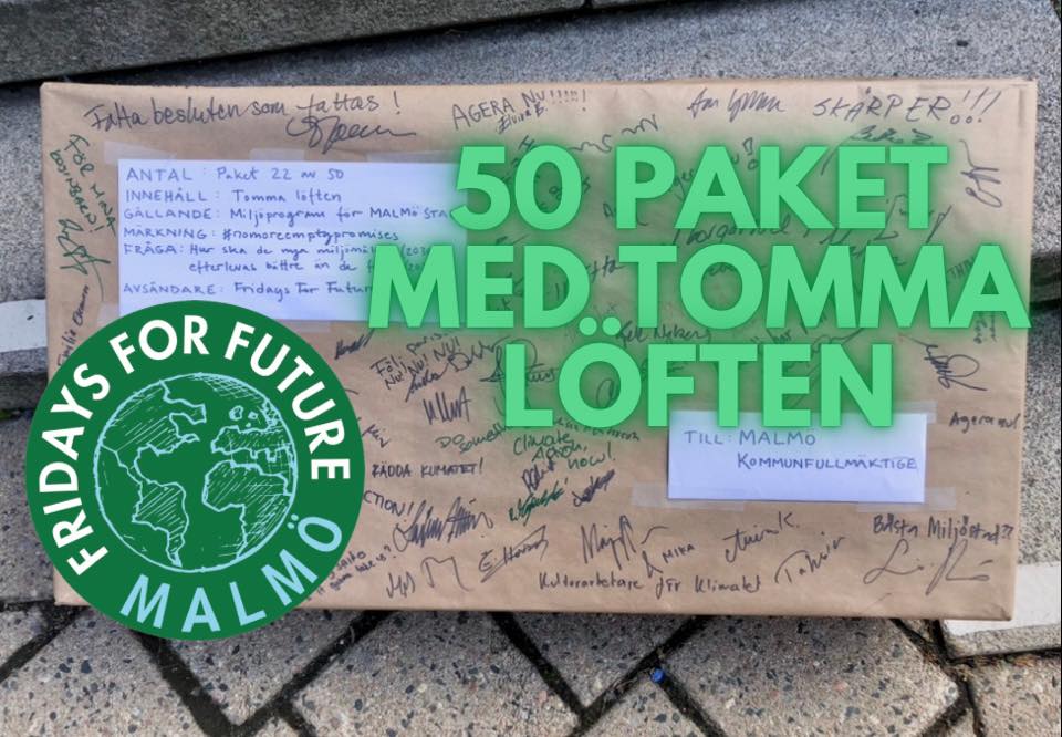 Fredagen den 3 juni är det Globala strejker inom Fridays For Future-rörelsen. I Malmö är vi som vanligt vid stadshuset och försöker påverka politikerna. I samband med Stockholm 50+ fredag den 3 juni kommer vi i Fridays for Future lämna vårt sista paket med tomma löften till Malmö Stad, men denna gång med ett innehåll!… Fortsätt läsa Fredag 3 juni, 50:e paketet