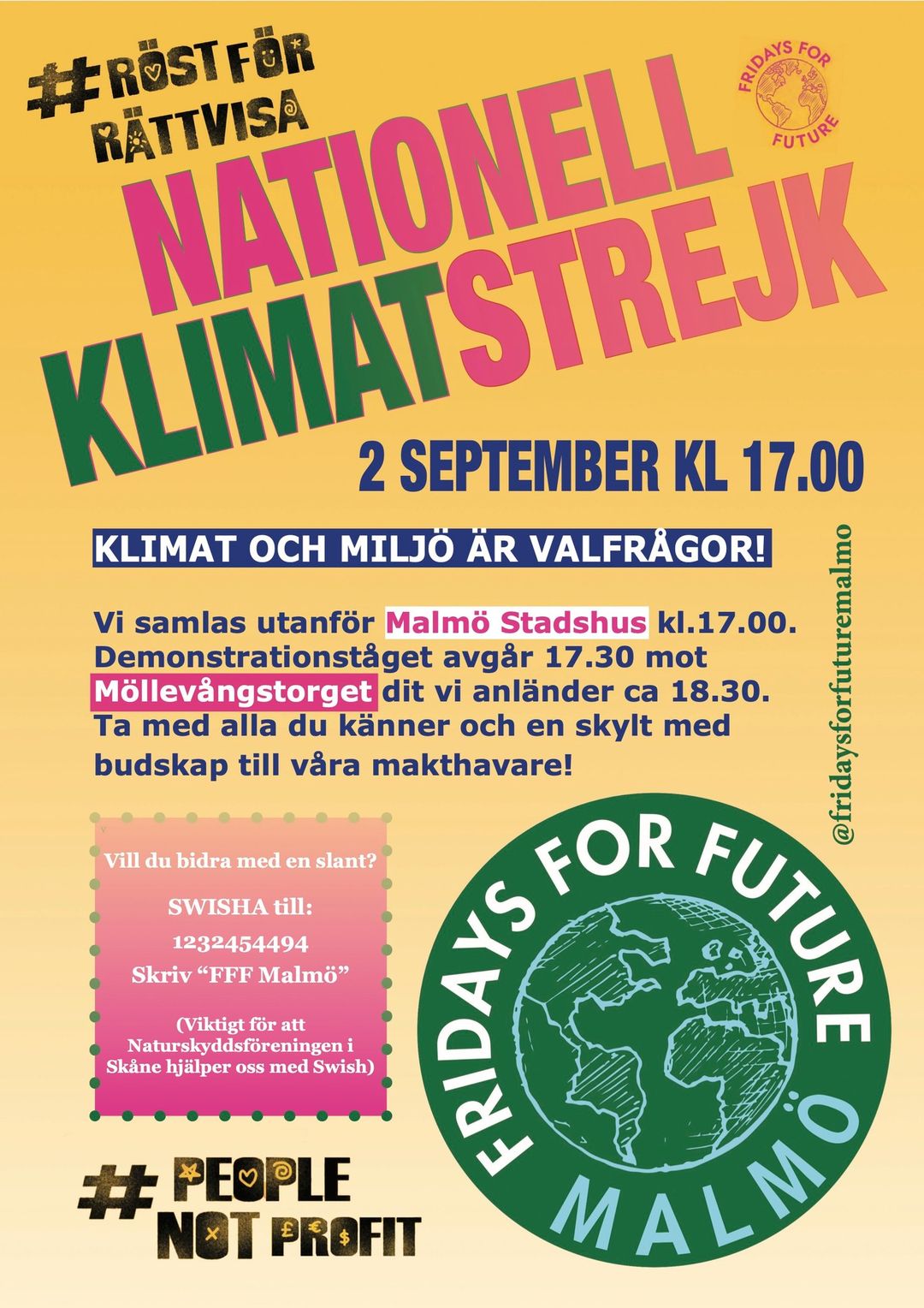 Fredagen 2 september blir det Nationell Klimatstrejk för att uppmärksamma klimatfrågan inför valet 11 september. I Malmö samlas vi 17.00 utanför Stadshuset där det bjuds på musik och tal. 17.30 avgår vi under ledning av trummor från BAM och budskap till vår omgivning om att uppmärksamma den klimatkris vi befinner oss mitt i. Vid Möllevångstorget… Fortsätt läsa Nationell Klimatstrejk 2 september