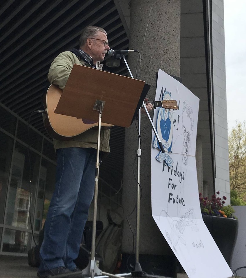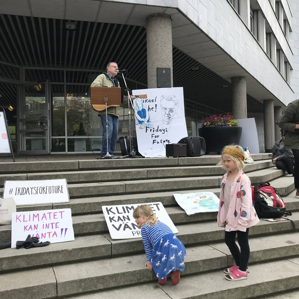 Fredag 10 maj 2019 Mikael Wiehe Idag kom Mikael Wiehe och bjöd på sång och musik. Bra uppmaning! Glada människor som vanligt. Många skyltar denna dag.